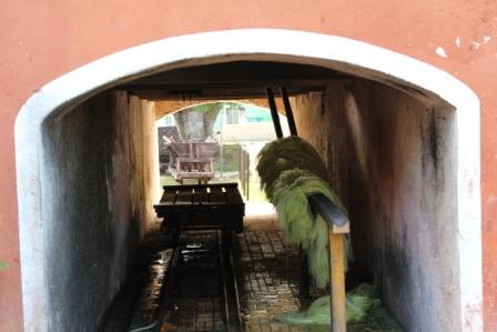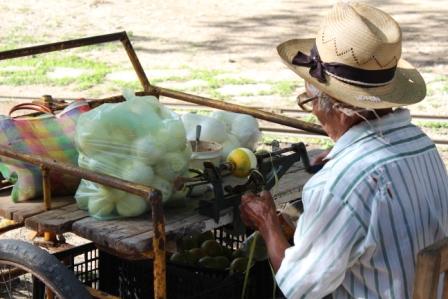 | Buiten de plantage zagen we deze man | Hij bleek bezig met een sinaasappelschilmachine | Voorkant van de woning van de plantage-eigenaar |