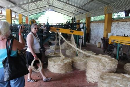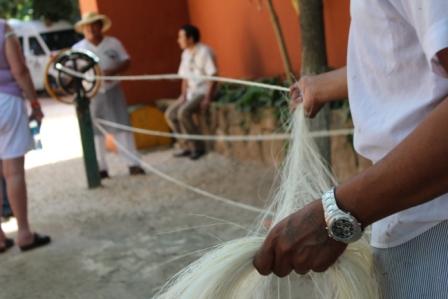 | Vroeger werd de sisalvezel met de hand gekamd | en gedraaid tot streng,meerdere strengen werden tot een touw gedraaid | |