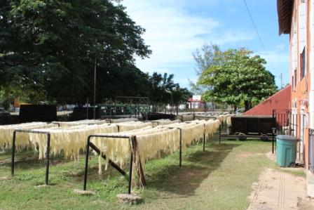 | De sisalvezels glijden langs een balk naar beneden | en worden te drogen gehangen | na het drogen wordt de sisal tot balen geperst |