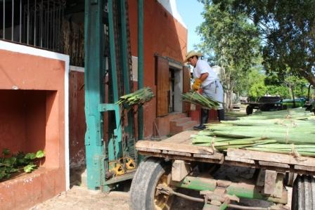 | Bij de machinale verwerking worden de agavebladen omhoog gehesen | de bladen worden op de lopende band gelegd | en door de pletmachine gevoerd |