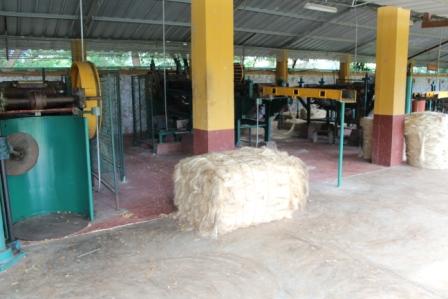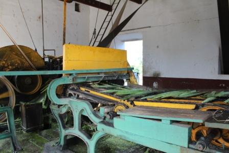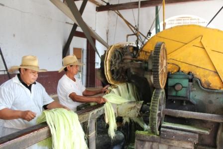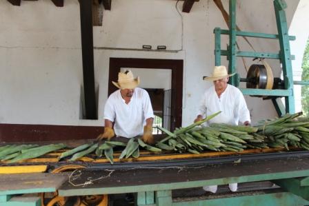 | In de machine worden de bladen dubbel gevouwen en de sisalvezels worden er uitgetrokken | waarna de groene pulp overblijft | |
