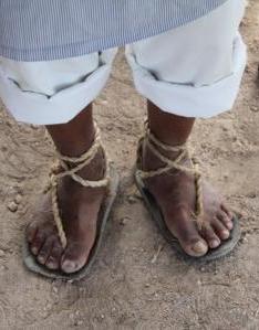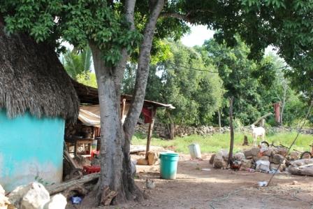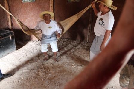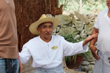 | Deze Maya (74 jaar) had zijn leven lang op de plantage gewerkt vertelde nu dagelijks over werken en wonen op de plantage | Hij droeg Sisal teen-sandalen | Een lemen woonhuisje en daar achter een kookruimte met stokkenwand |