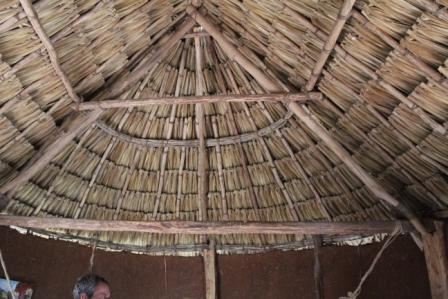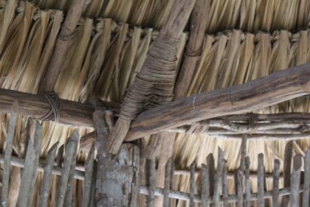 | Het dak, gedekt met palmbladeren | de dakconstructie zonder spijkers, alleen natuurlijk materiaal | demonstratie van verschillend gebruik van de hangmat |