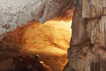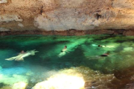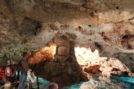 | Cenote, een druipsteengrot met vleermuizen en kraakhelder water waarin een deel van de groep een duik nam | ||