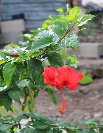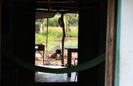 | Voor- en achterdeur tegenover elkaar, achter de ingang een hangmat | Een kijkje achter het huis, waar zich het dagelijks leven afspeelt | De buren hadden een huisje met een golfplaten dak, gemaakt van gerecycled afval, een soort karton met waterafstotende laag |