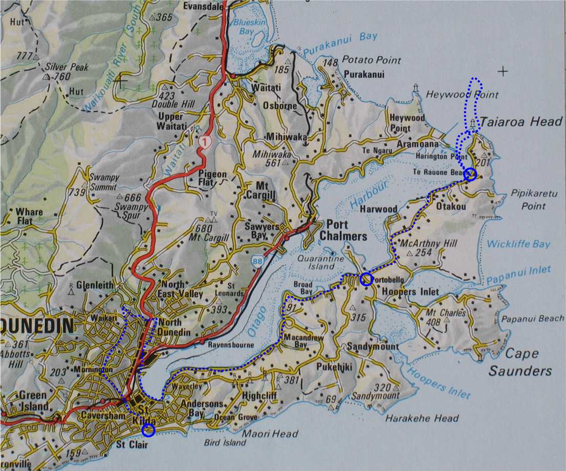 Dunedin-St.Kilda Vandaag is het Labourday, een Nationale feestdag. Helaas voor alle vrije Nieuw-Zeelanders is het wat druilerig weer, dus voor ons wordt dat een museumdagje Maar eerst gaat de reis vanuit Portobello naar de punt van het schiereiland waar we in Wellers Rock op de boot stappen voor een "Wildlife Tour" rond Taiaroa Head waar we Albatrossen en Zeehonden hopen te zien Daarna naar de musea in Dunedin |