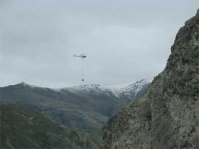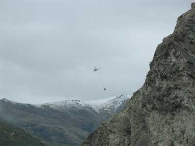 Nog maar net op weg of alle verkeer werd stopgezet. Een helikopter schepte water uit de rivier naast ons en gooide dat op de berg voor ons. Na vier keer heen en weer vliegen mochten we weer verder. Er werd gewaarschuwd voor vallend gesteente en we denken dat het water bedoeld was om de zaak boven vast te houden. | ![]() |