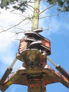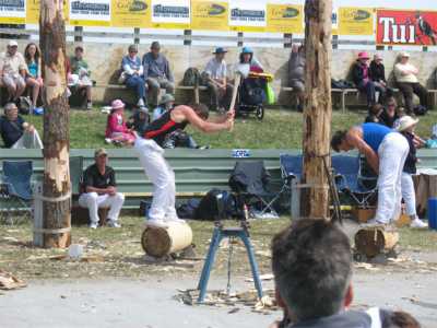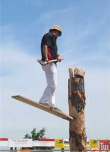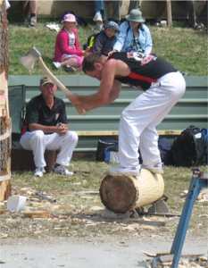 Vervolgens wedstrijden houthakken. De houthakkers hadden kisten vol met de prachtigste bijlen