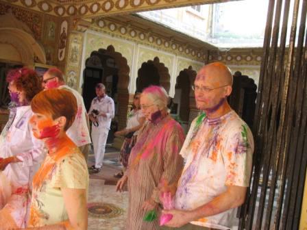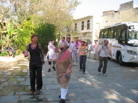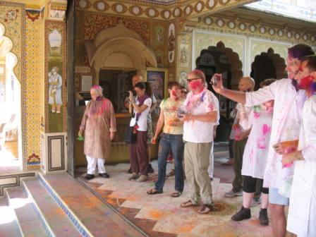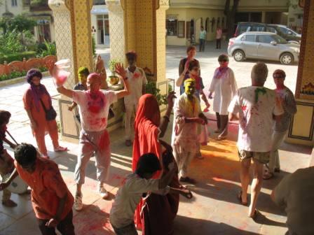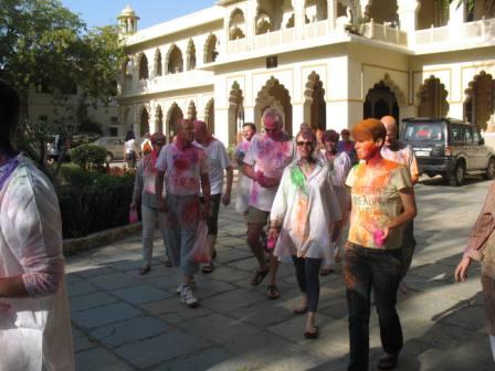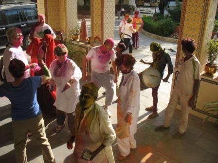 | onze reisgroep met hotelpersoneel viert Holi bij de hotelingang | en in de hal | onder muzikale begeiiding |