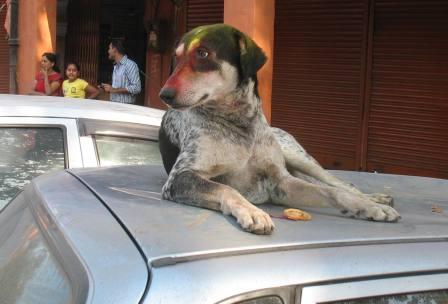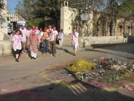 | nog een "Happy Holi" ontmoeting | zelfs de honden doen mee | voor de volledigheid moet ook de fotograaf er nog even gekleurd op |