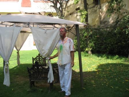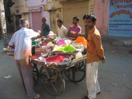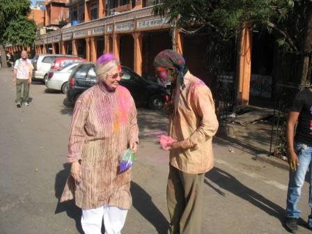 | de resten van een straatvuur voor de ingang van het hotel | overal wordt de verfpoeder verkocht | een lokale Hindoe wordt door Marijke bestrooid, Happy Holi |