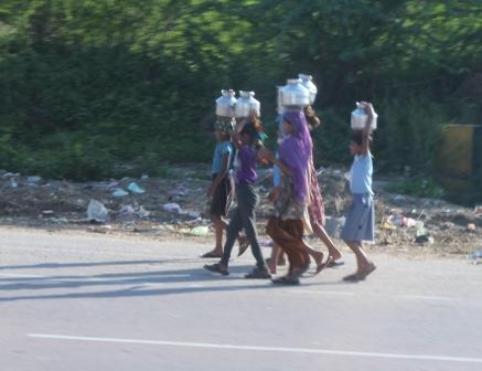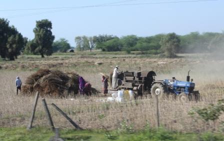 | Overal op het land wordt de oogst binnengehaald, met de hand of met "combines" | lasten worden ook hier door vrouwen op het hoofd gedragen |
