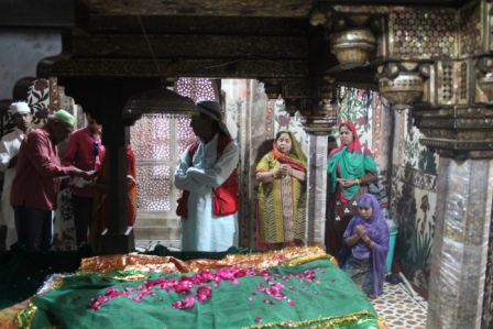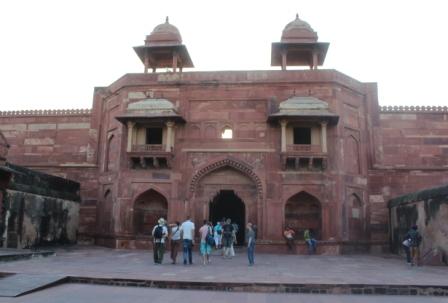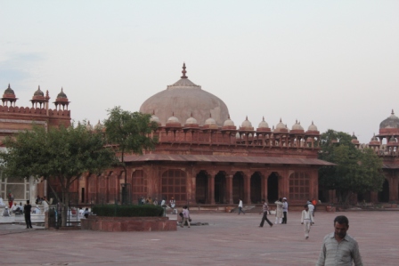 alsnog drie zoons zou krijgen, en die kreeg hij ook. Toen Salim Chisti stierf liet Akbar de tombe bouwen, net als de rest van het complex opgetrokken uit rode zandsteen en een koepel. Later werd de tombe bekleed met wit marmer, en samen met het ver overhangende dak en de zuilen versierd met slangen zorgt dit er voor dat de tombe nogal opvalt in het geheel. Vooral het slangenmotief voor de zuilen is apart, omdat er verder nergens een levend wezen wordt afgebeeld. Salim Chisti werd, en wordt nog steeds, vereerd door hindoes en moslims. Kinderloze vrouwen komen naar de tombe en binden gekleurde linten aan de tralies van het grafkamertje en bidden. Gaat de wens in vervulling dan keren ze terug en halen het lint weg. |