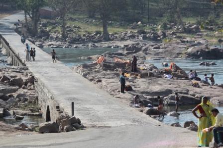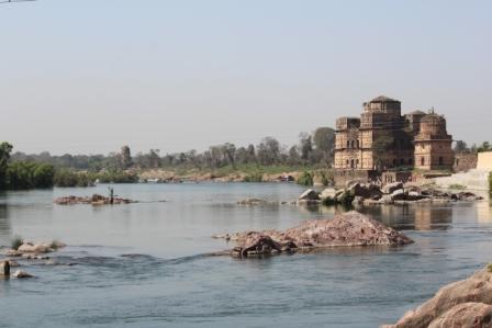 | zicht op de, niet bevaarbare, Betwa rivier | de Chatri aan de rivieroever | brug over de Betwa rivier |