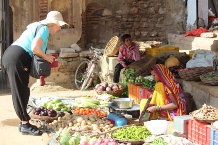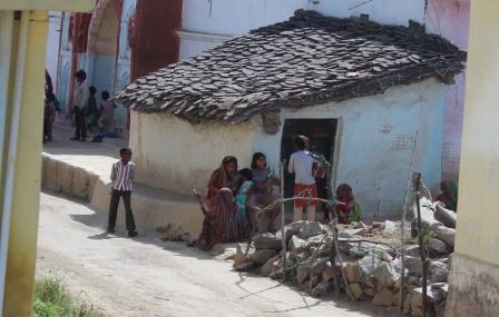 | door het hele dorp zie je deze minimarktjes | legers apen bevolken de tempels | de Chaturbhuj tempel |