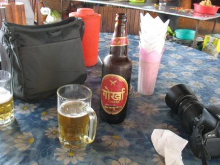 | de lunch in een wegrestaurant met een lemen fornuis en pannen met leem | en natuurlijk een lokaal biertje | we waren al in bergachtig gebied, voortuin van de Himalaya |