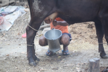 | in de dorpen heerst een enorme drukte op straat en alles toetert en belt | maar buiten het dorp wordt in alle rust de heilige koe gemolken | en lopen de drie gratiën op blote voeten over de keienpaden |
