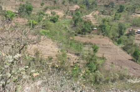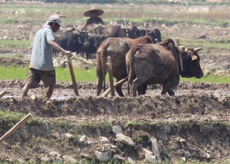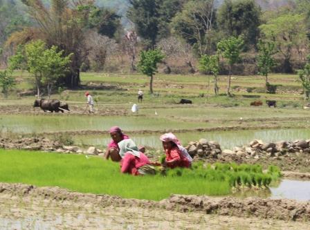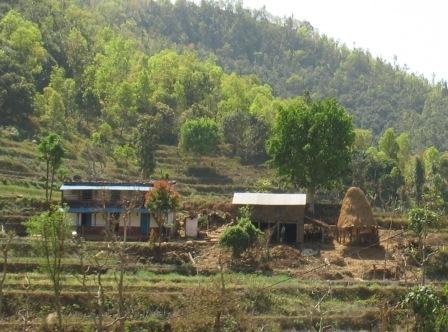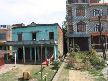 | nog een voorbeeld van oude en nieuwe huizenbouw in Nepal | een lappendeken van rijstveldjes waar vooral vrouwen met de rijstplanten werken, de mannen hebben hun ossen en doen de waterhuishouding op de veldjes | |