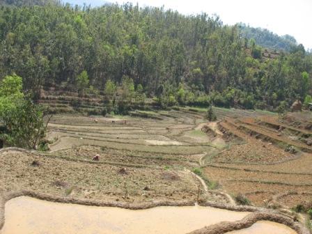 | een dorpje tussen de terrassen | grillig gevormde rijstvelden met of zonder water, met of zonder rijst in diverse stadia. Meestal worden twee oogsten per jaar gehaald | |