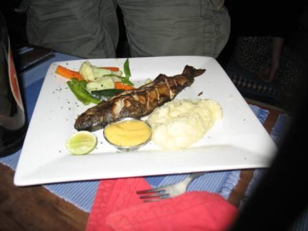 | Het eten ;s avonds in Pokhara smaakte goed, Marijke had chicken in the basket en Cees een regenboogforel | ||
