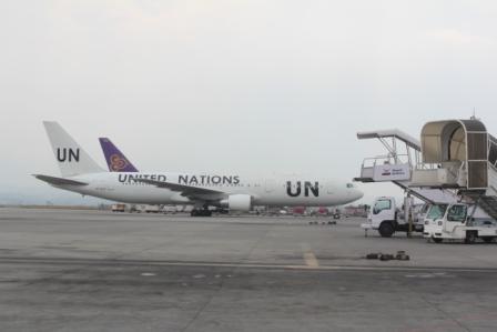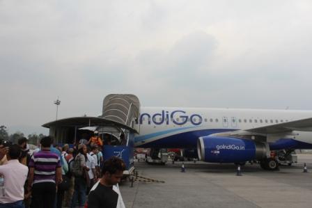 | ons IndiGo vliegtuig naar Delhi | naast ons stond een vliegtuig van de Verenigde Naties | op weg naar de startbaan |