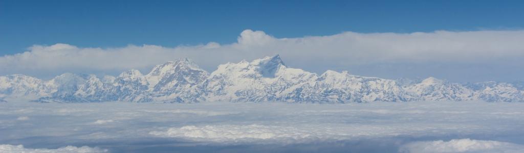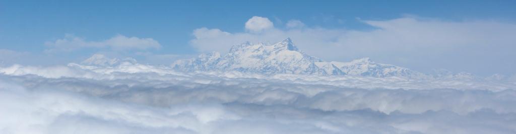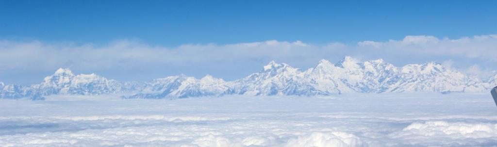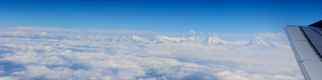 | maar toen we boven de wolkenlaag uitkwamen hadden we een prachtig zicht op de besneeuwde toppen van de Himalaya |