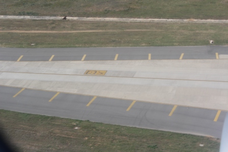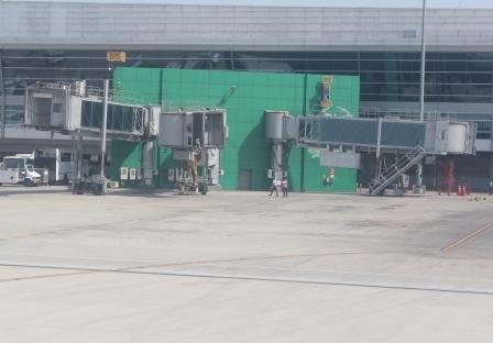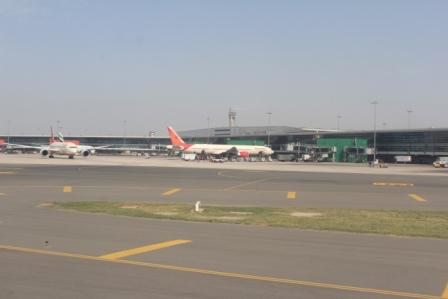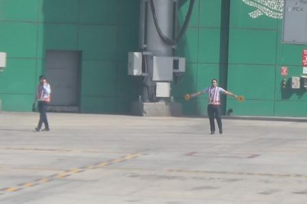 | aankomst op Indira Gandhi International Airport | de terminal | onze loods dirigeert het vliegtuig naar z'n plek |