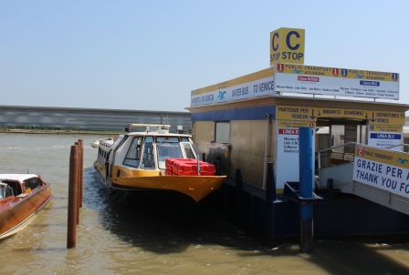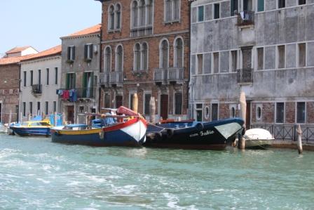 | ons Alilaguna-rode lijn schip bij de luchthaven | we worden voortdurend ingehaald door veel te snel varende taxi's | In het kanaal door Murano zien we deze oude vrachtschepen |