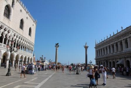 | Het San Marco plein met klokkentoren en rechts het Dogenpaleis | voor het Piazetta-plein de zuilen met links de Marcus-leeuw | en de San Marco Basiliek |