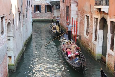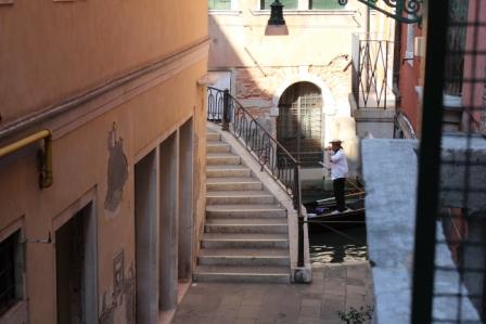 | passerende gondelier, vanaf ons balkon gezien | even wat eten in een steegje naast ons hotel | dan Venetië verkennen, maar niet per gondel |
