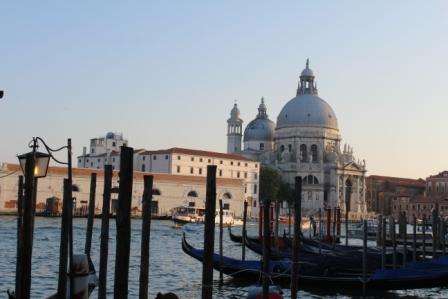 | de kerk "iI Redentore" gebouwd door Palladio | massa's gondels in de kanalen | en voor de huizen langs Canal Grande |