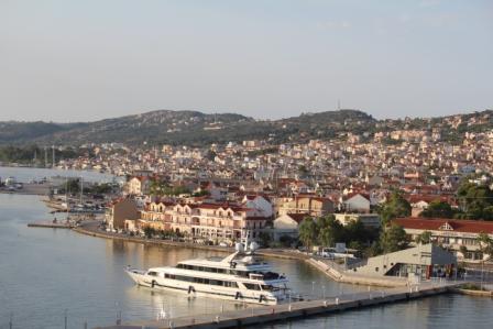 | onze steiger in de haven van Argostoli was zo klein dat de helft van het schip uitstak en de achtertrossen met een bootje aan een boei moest worden vastgemaakt | overzicht van de haven van Kefalonia en de stad Argostoli | |