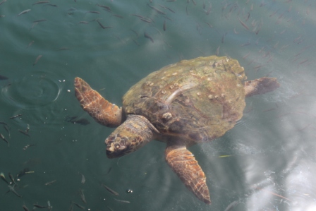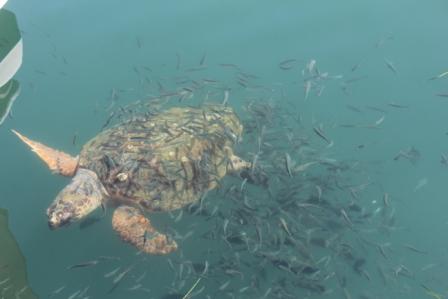 | Omdat de vissers de te kleine vis uit de netten overboord gooiden kwamen de Loggerhead schildpadden, vergezeld van grote scholen kleine visjes, het visafval opruimen | ||