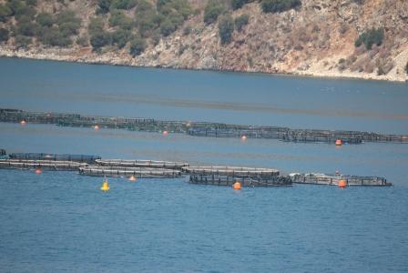 | de andere kant was bedekt met groen bos | midden in de baai naar de haven lag een viskwekerij | bij een hotel tegenover onze steiger zat een zwaluwnest |