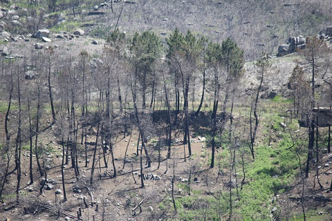 we laten het vlakke land achter ons en trekken verder de Estrela in | op veel plaatsen zien we de trieste resten van bosbranden | en een wilde kanarie tussen de dode takken |
