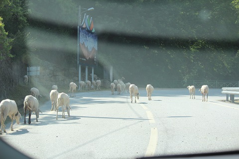 In Manteigas maken we een tussenstop voor een tonic met ijs | we worden uitgeleide gedaan door een kudde Mantageise schapen |
