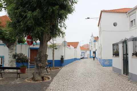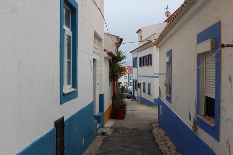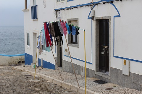 | keienstraatje in Ericeira | voor een vissersplaats klassieke manier om de was buiten te hangen | het strand met achter de pier het vissershaventje |