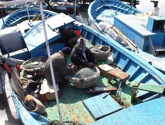 | de vissersschepen overdag terug in de haven | op de steiger worden de staande netten geboet | aan boord worden de lijnen voor de hoekwantvisserij klaargemaakt |