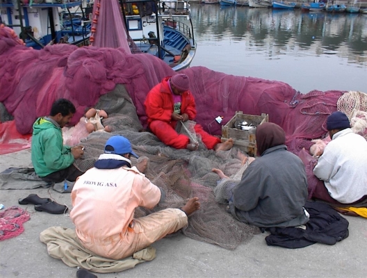 | Een deel van de vissersvloot vist met staande netten die op de kade worden geboet | ||