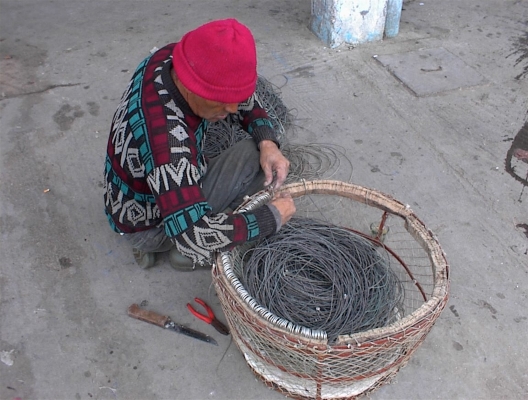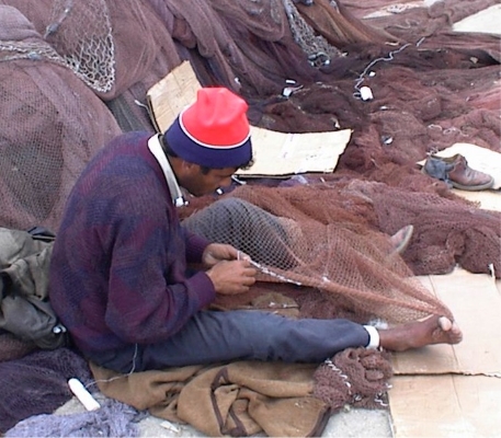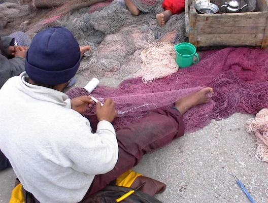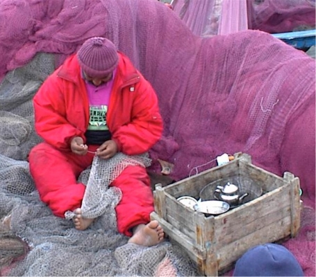 Na iedere reis worden de netten hersteld. De netten worden met de tenen strak gehouden waarna met behulp van een boetnaald de gaten worden gerepareerd. In de kist wordt koffie gezet |