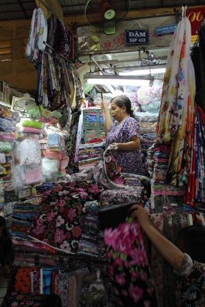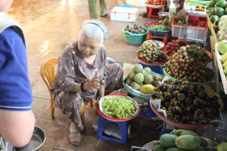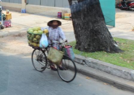 | Vruchten, o.a. lychee's per fiets | nog meer exotische vruchten | De handelaarster staat bovenop de stapels lappen |