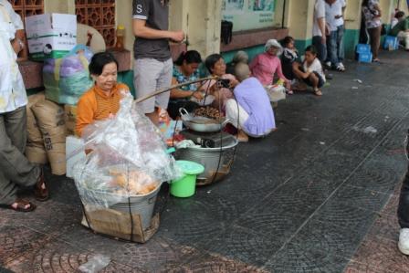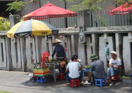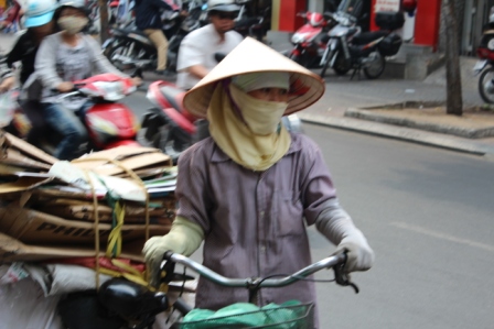 | De Vietnamese lunch op straat | Gesluierd tegen de smog, in Nederland niet meer toegestaan | en overal bromfietsen die bij rood licht en zebrapaden gewoon doorrijden |