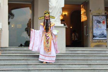 | De Vietnamese stedelingen zijn voor het merendeel vermomd met maskers, hoofddoeken en ronde hoeden | de straathandelaren komen erg traditioneel over | |