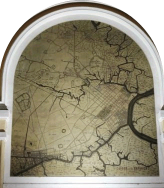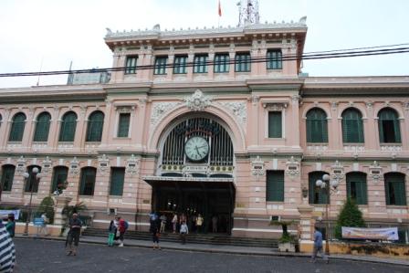 | Tegenover de kathedraal het postkantoor in koloniale stijl. | In de hal hangen twee enorme plattegronden van Indo-China | ||