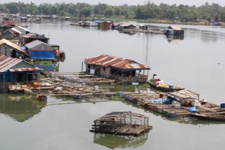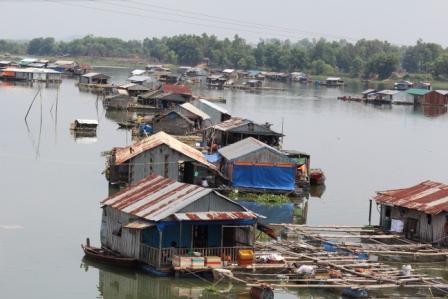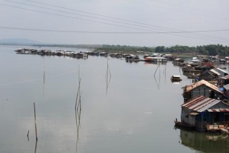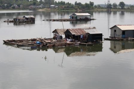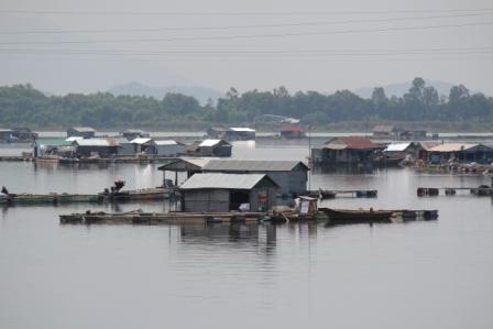 | In de provincie Dong Nai reden we over een uitloop van het Tri An Reservoir waar we deze drijvende visserijbedrijven zagen | ||
