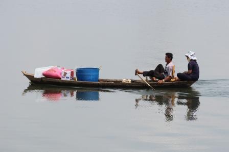 | Vaas waar ga je met die bromfiets heen | We naderen het berggebied | Toch nog een houten woon/vrachtscheepje gespot |