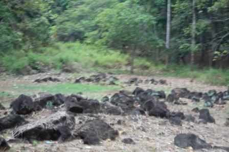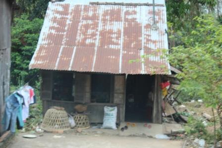 | In de bossen zie je overal grote brokken lava steen liggen | Een houten woning met golfplaten dak | Meisjes in traditionele dracht: Lange jurk en lang haar |
