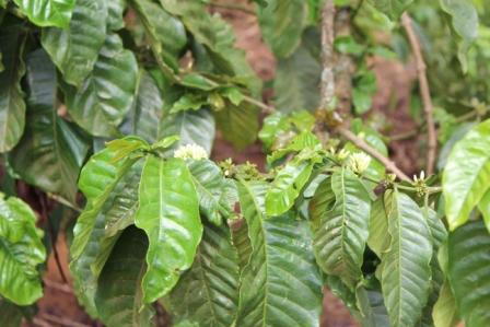 | In het midden een veld met theeplanten | Theeplantage op terrassen | Koffieplant in bloei |