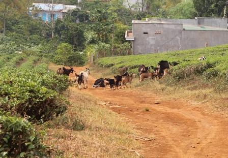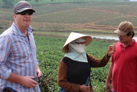 | Tussen de thee-bedden stak een groep geiten over | De geitenhoedster in gesprek met onze reisleider Laurens en gids Hoang | De waterval Thac Gougah bleek grotendeels te zijn opgedroogd |