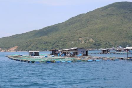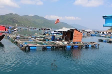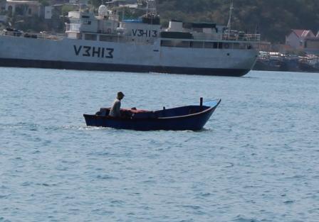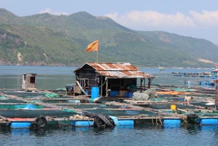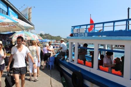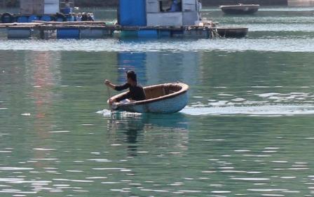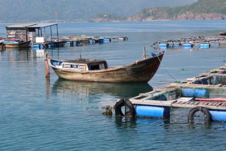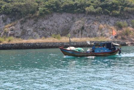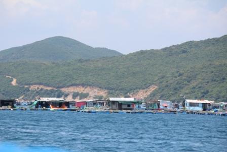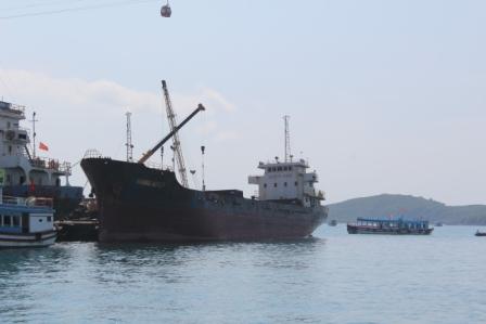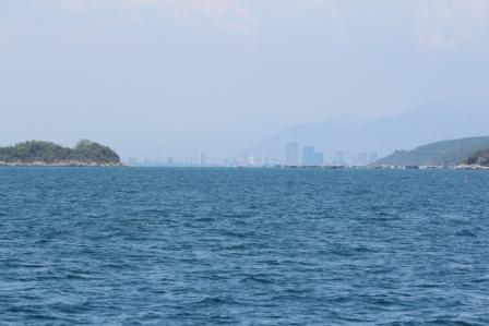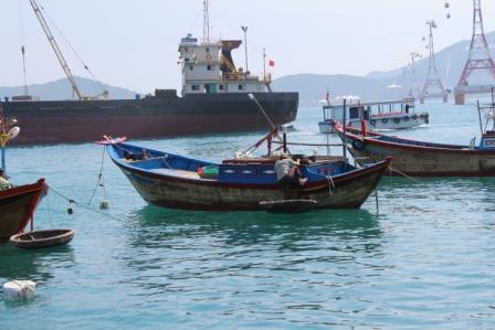 | We stapten aan boord voor een tocht langs de eilanden voor Nha Trang | In de baai liggen veel vissersschepen maar ook enkele coasters | |